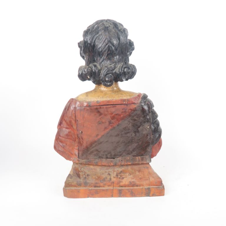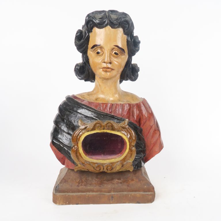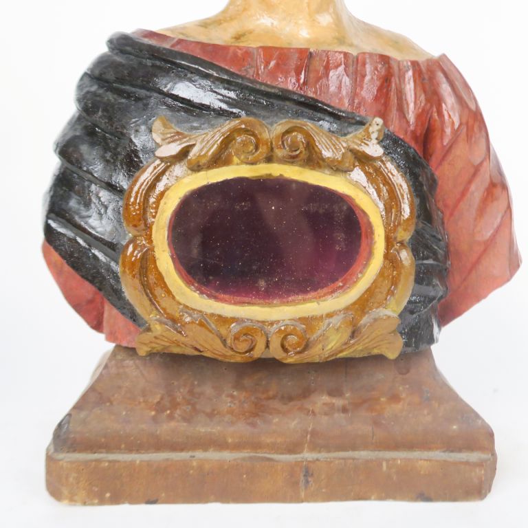 Reliquaire en bois sculpté polychrome figurant un buste d'homme, ajouré et vitré en son centre. H. 47 cm. (Restauration).