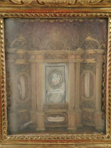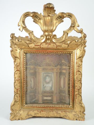 Reliquaire en paperolles fin XVIIIe-début XIXème, en forme de maitre autel baroque. Bel encadrement en bois sculpté et doré, fronton ajouré (accidenté). 70 x 44 cm