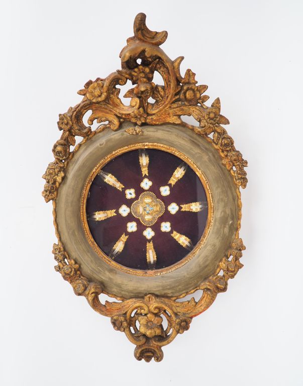 Reliquaire Napoléon III dans un cadre médaillon en bois et stuc doré. Dim. 67 x 42 cm