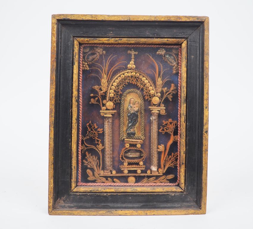 Reliquaire XIXème en paperolle en forme de chapelle de la Vierge à l'enfant, cadre en bois noirci et doré. Dim. 24 x 19,5 cm