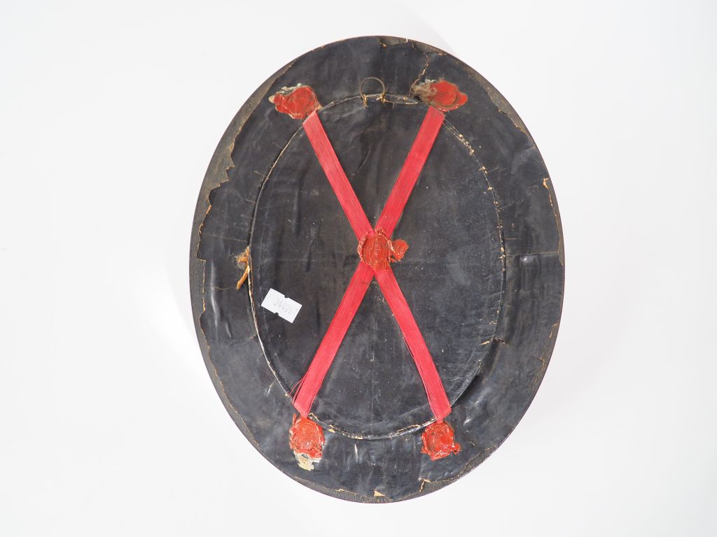 Reliquaire XIXème ovale en paperolle à décor de Maitre Autel, cadre en bois noirci fendu. Dim. 31 x 24 cm