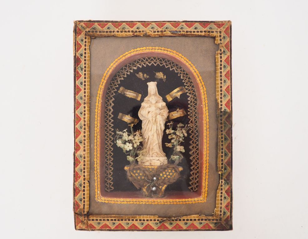 Reliquaire XIXème "Vierge à l'Enfant" en plâtre ou biscuit. (sans cadre) Dim. 24,5 x 18,5 cm