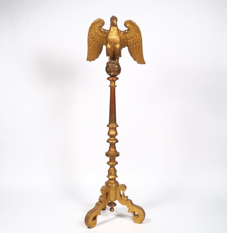 Sculpture en bois doré XIXème figurant un aigle aux ailes déployées sur un piétement tripode en forme de balustre. H. 169 cm (choc sur une aile)
