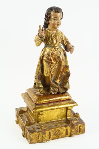 Sculpture espagnole fin XVIIème début XVIIIème en bois doré et polychrome 'l'enfant Jésus'. Sur un socle en bois doré. Hauteur de la sculpture 39 cm, hauteur avec le socle 57 cm