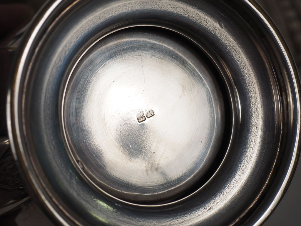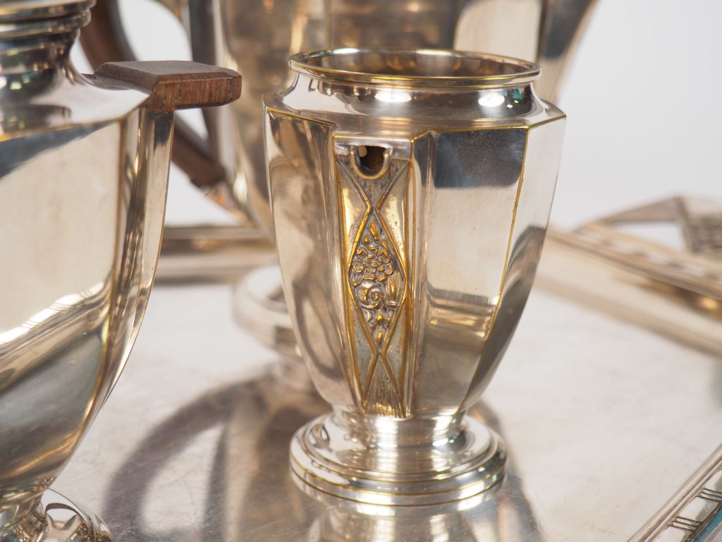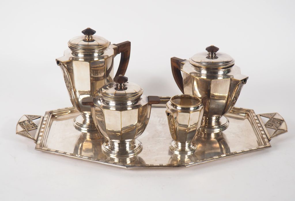 Service à café et à thé Art Déco en métal argenté, à décor de fleurs dans une réserve géométrique comprenant : un plateau et 4 pièces de forme.