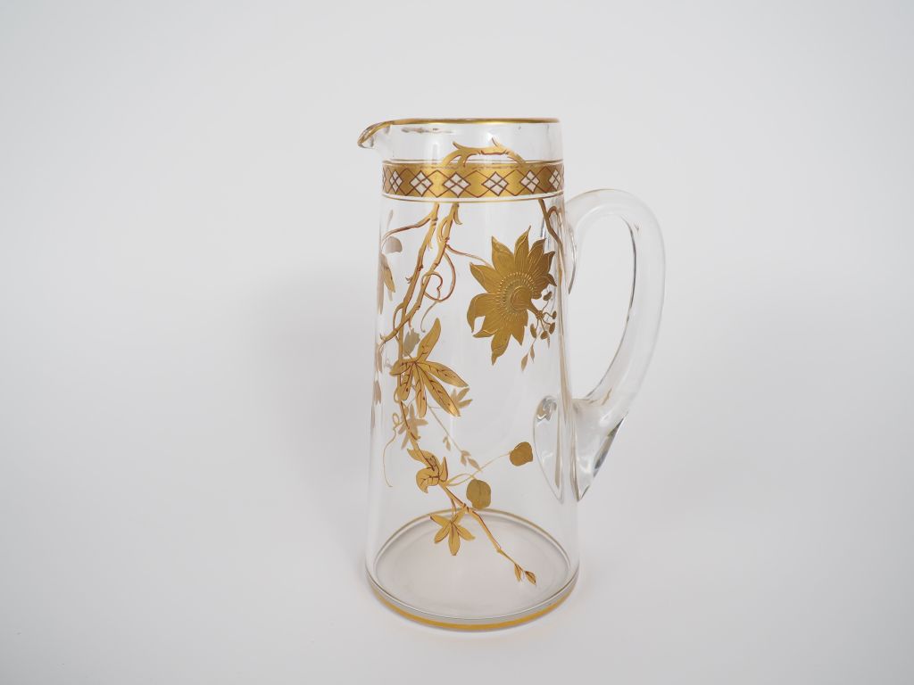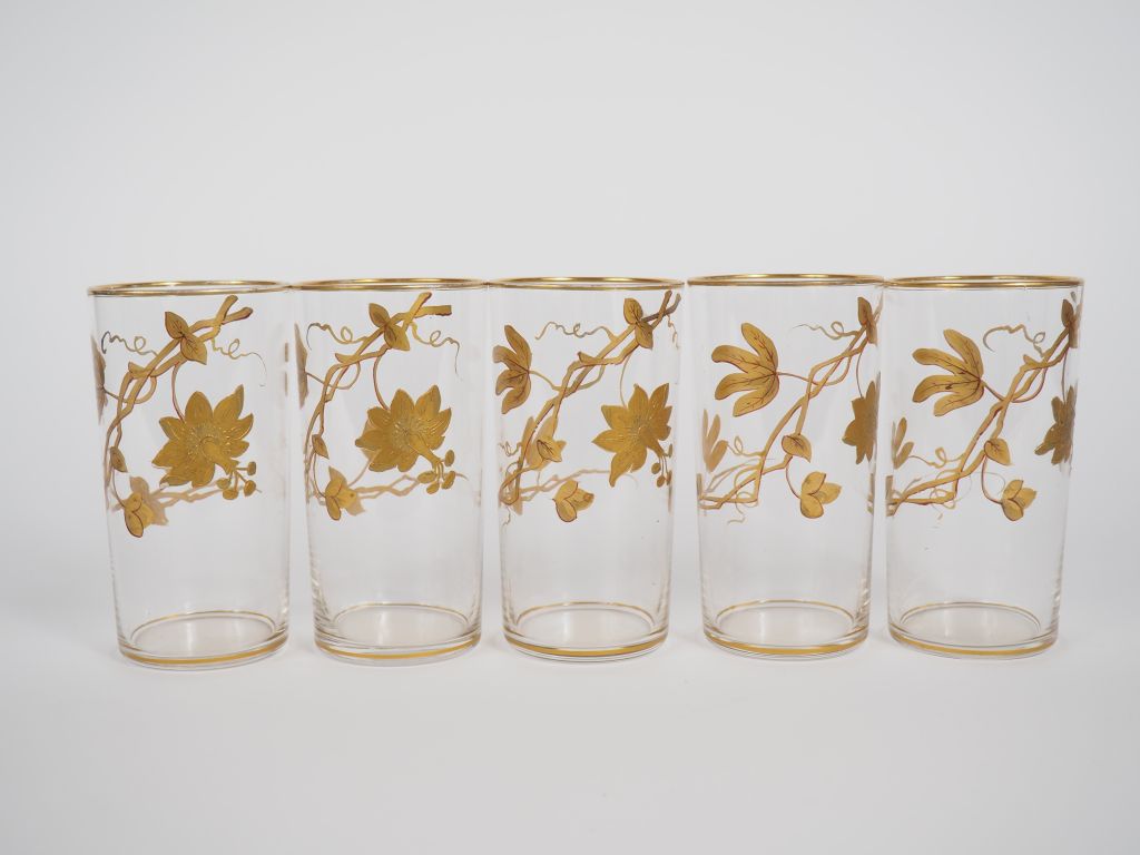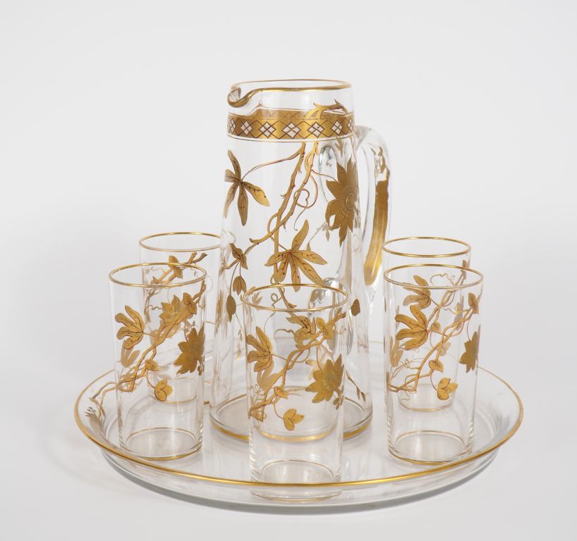 Service à orangeade 1900 en cristal à décor émaillé et doré de fleurs et de branchages comprenant : un plateau et 5 verres.
