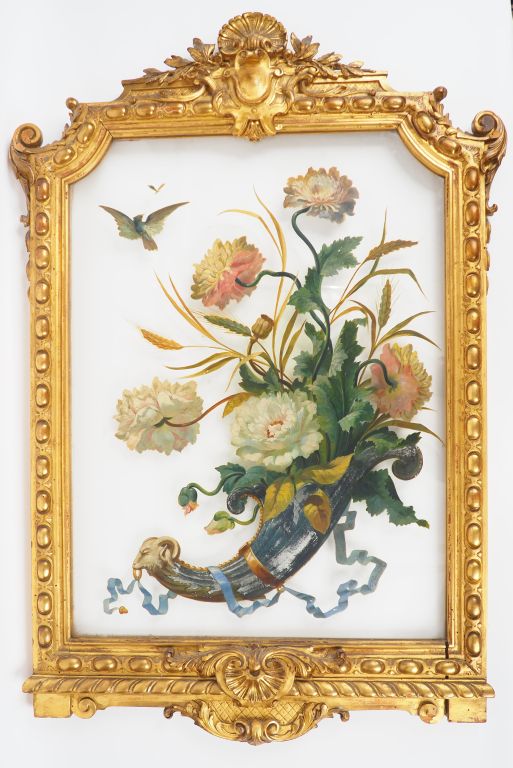 Signé A. GUIMARD. "Corne d'abondance" Peinture sur verre XIXème. Signée et datée 1887. Dim : 70,5 x 52 cm.