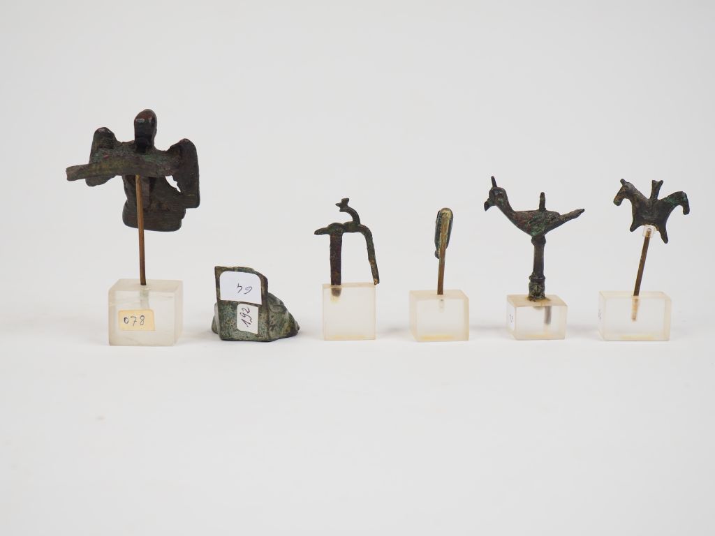 Six petits bronzes zoomorphes antiques et/ou médiévaux. H. : 3.2 cm, 2,2 cm, 4,5 cm, 5 cm, 5.2 cm, 2.5 cm.