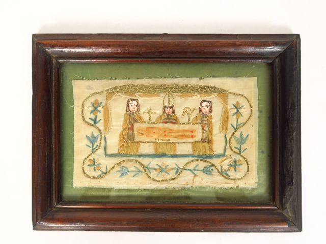 Soie brodée XVIIIème encadrée "Présentation du Saint Suaire" Dim. 18 x 10,5 cm