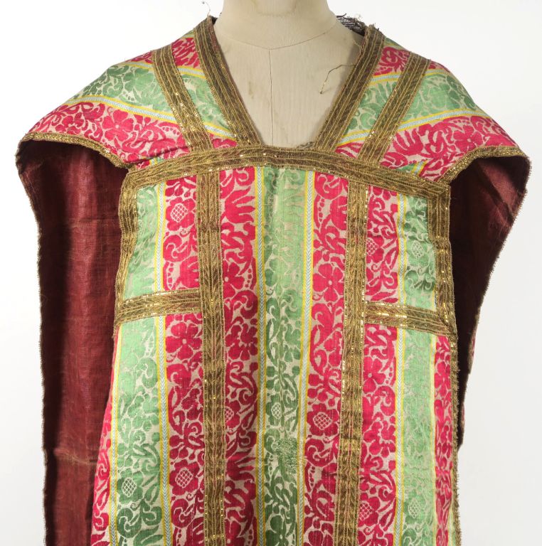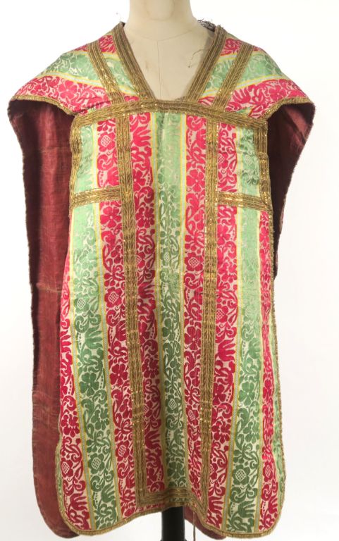 Somptueuse chasuble XVIIIème, probablement d'origine espagnole, en soie façonnée, décor lancé à rayures polychromes rouges et vertes, galon or d’époque. Doublure bougran rose. Bel état d’usage. Expert : Véronique Dumont Castagné
