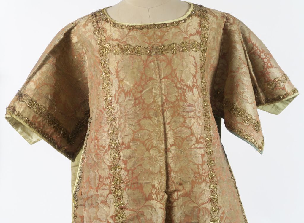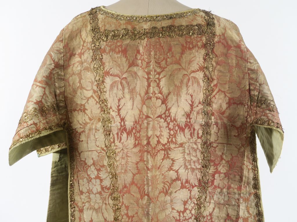 Somptueuse dalmatique Louis XV avec son manipule, étoffe façonnée,à décor lancé aux fils d’or, dentelle or d’époque, doublure soie verte. Bel état général. Expert : Véronique Dumont Castagné