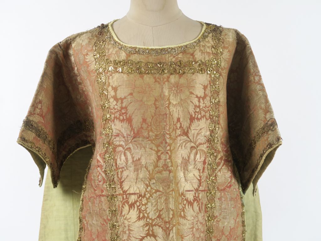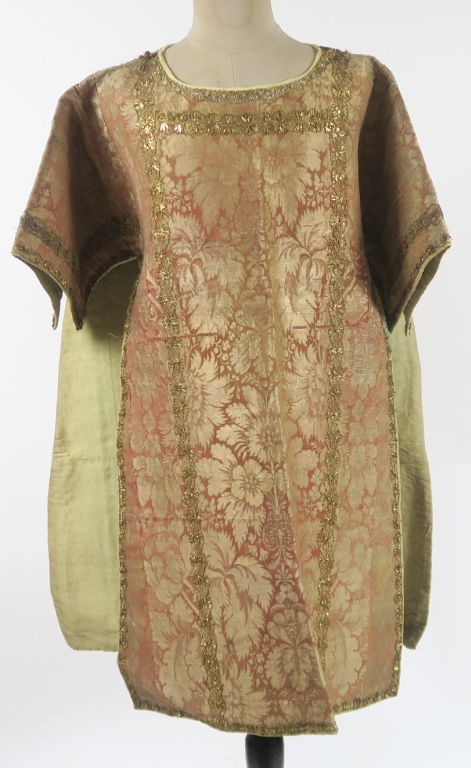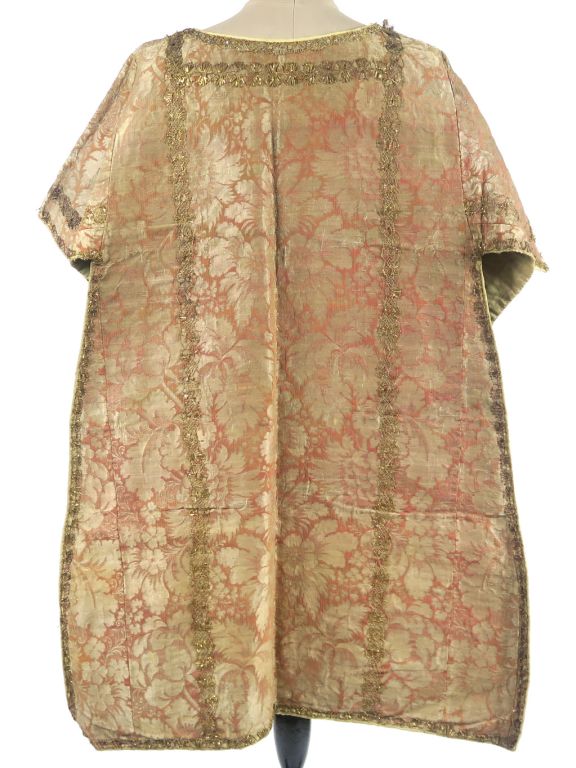 Somptueuse dalmatique Louis XV, étoffe façonnée, décor lancé aux fils d’or, dentelle or d’époque, doublure soie verte fusée par endroits. Bel état général. (sans son manipule) Expert : Véronique Dumont Castagné