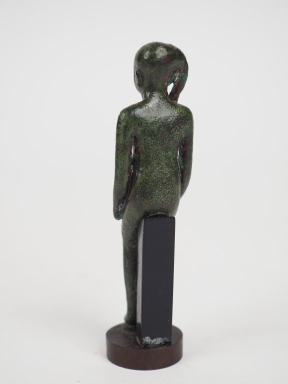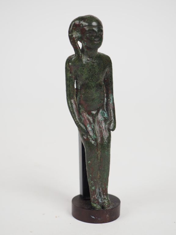 Statuette en bronze d’Harpocrate assis, avec sa mèche de cheveux caractéristique. Basse Epoque ou période ptolémaïque. H. : 9 cm.