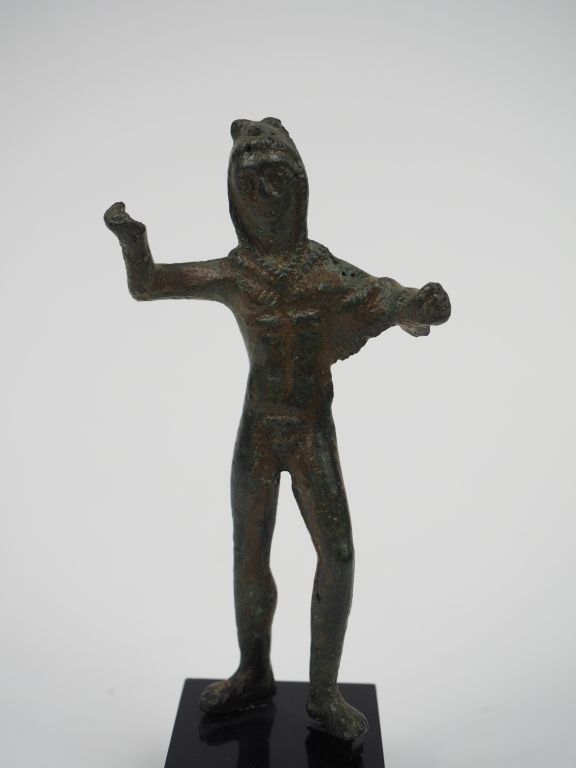 Statuette en bronze d’Hercule revêtu de la peau du lion de Némée. Période étrusque (IV-IIe s. av. J-C.). Manques (massue et vêtement sous le bras gauche). Un exemplaire similaire au musée de Cortone. H. : 10.7 cm.