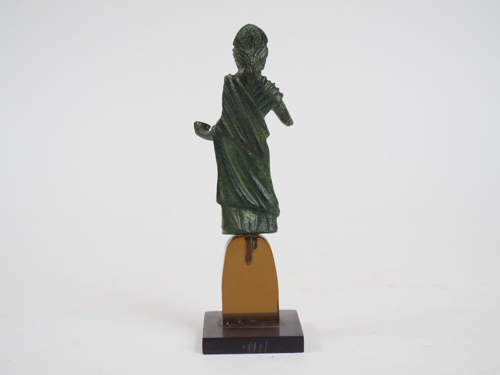 Statuette en bronze d’une femme ou déesse romaine (Fortuna ?) tenant une patère dans sa main gauche. Ier-IIIe s. apr. J.-C. La main droite manque. H. : 10 cm.
