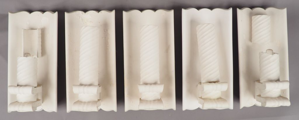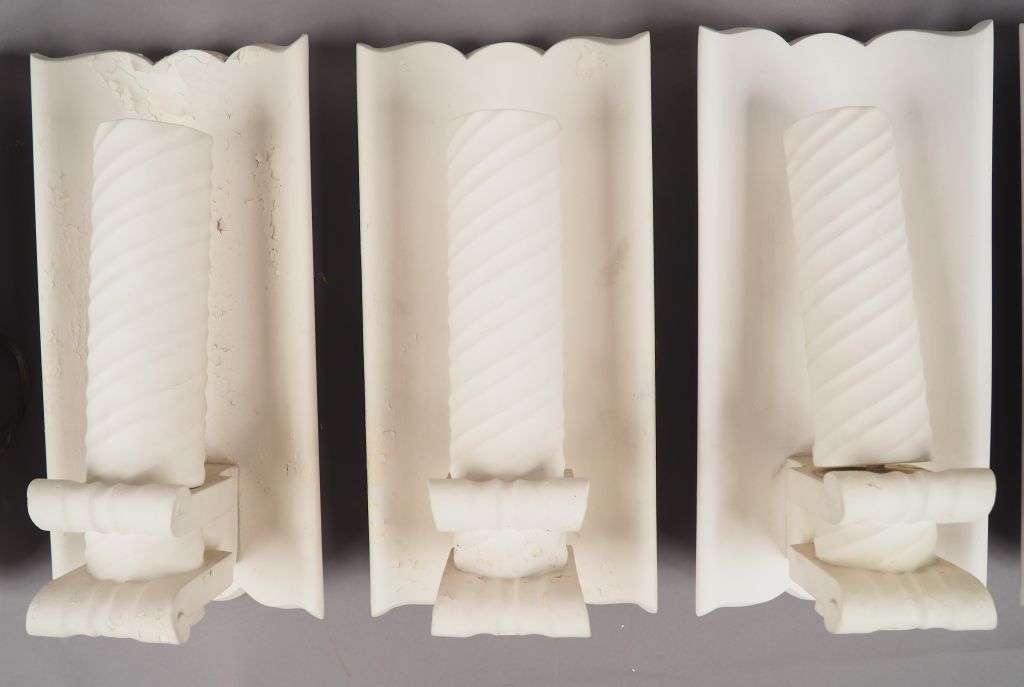 Suite de cinq appliques Art Déco en platre sculpté. Deux portent une étiquette "Lum Art". H.: 40 cm. (Deux accidentées)