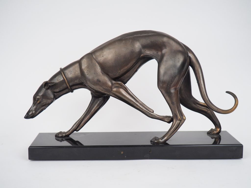 Sujet Art Déco en régule patiné et marbre noir "le lévrier". Dim. 32,5 x 52 x 15 cm (socle accidenté)