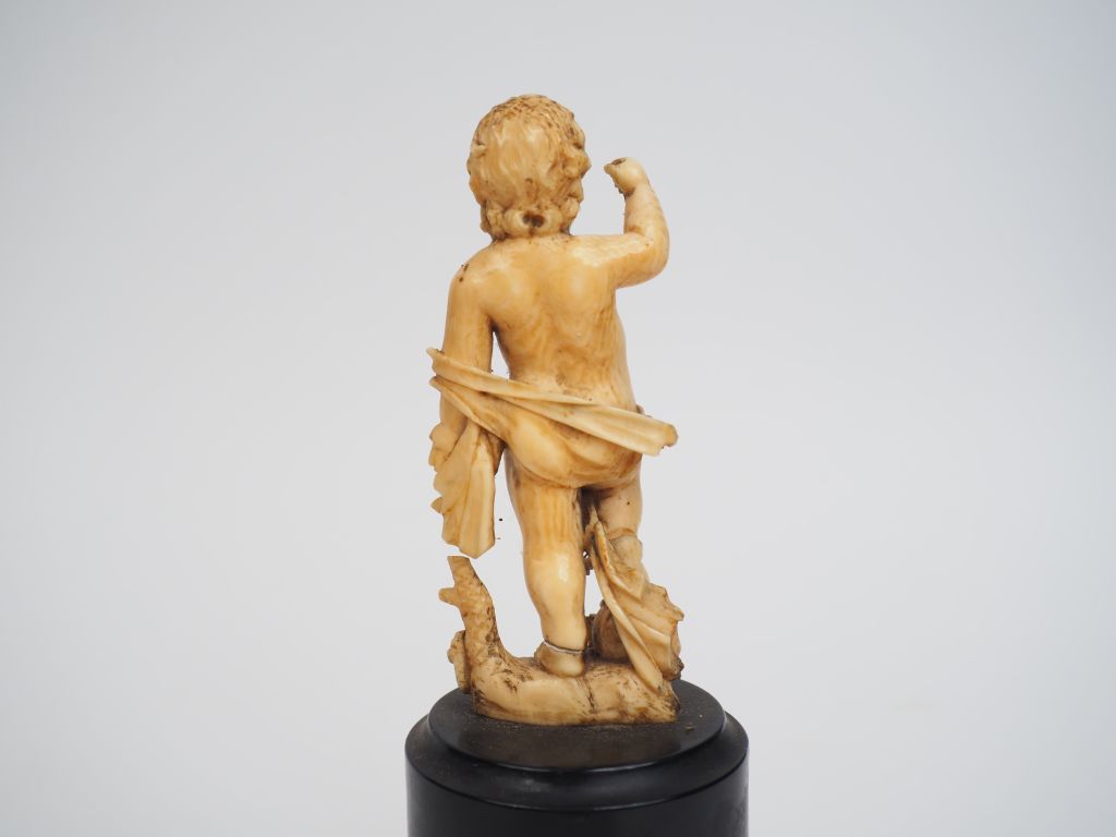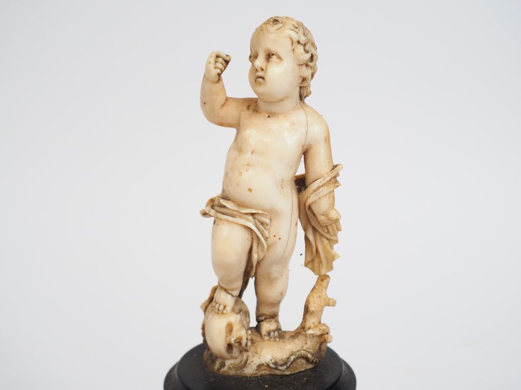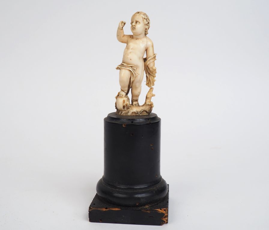 Sujet en ivoire de Dieppe « Enfant Jésus » Sur un socle en bois noirci. H. sans le socle : 10 cm H. totale : 19,5 cm (accident et restauration)