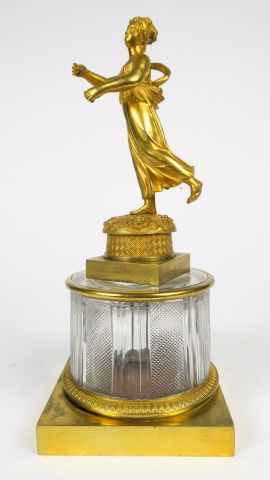 Sujet XIXe en bronze doré et cristal figurant une jeune fille à l'antique. H. : 24 cm (manque)
