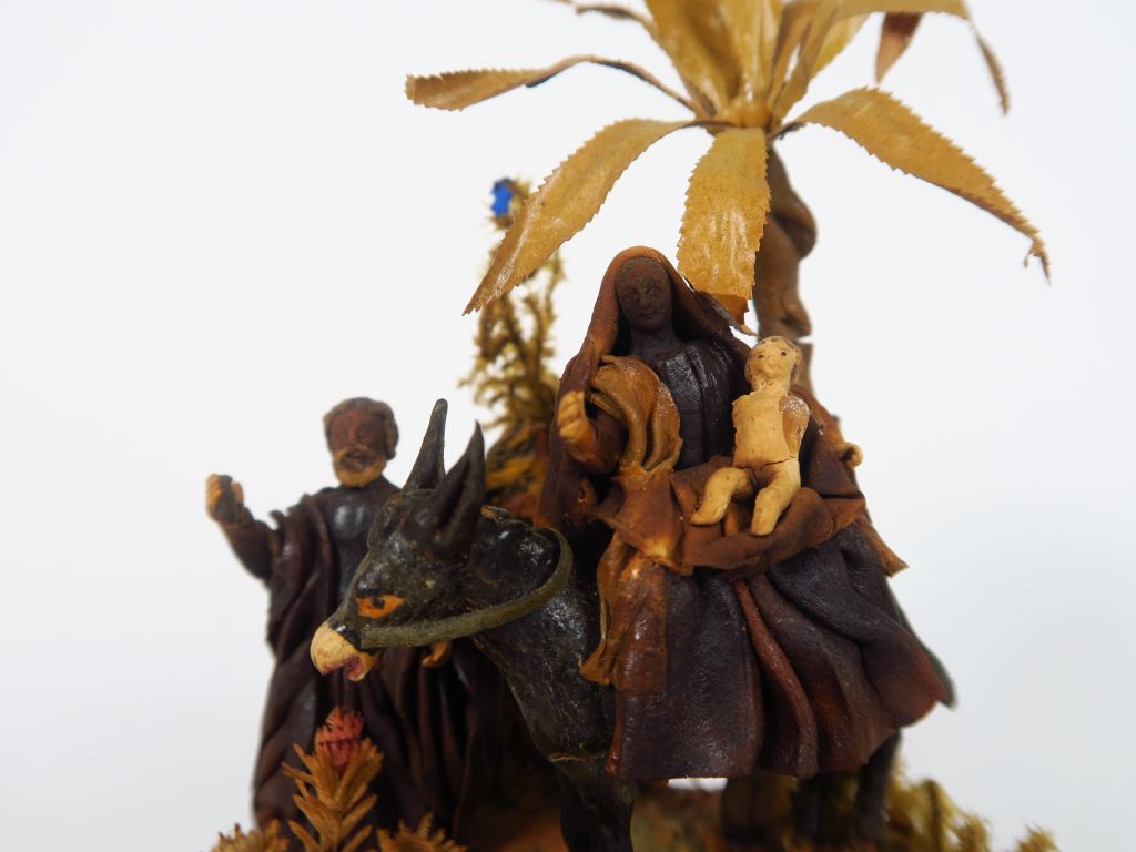 Sujet XIXème en bois sculpté et matériaux composites polychrome "La Sainte Famille". Sous globe. H. 15 cm