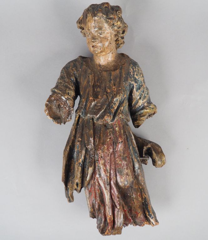 Lot de Sujet XVIIème en bois polychrome "Ange" H. 49 cm (manques) au prix de 450 à 600 € en vente aux enchères par l'hôtel des ventes Primardeco