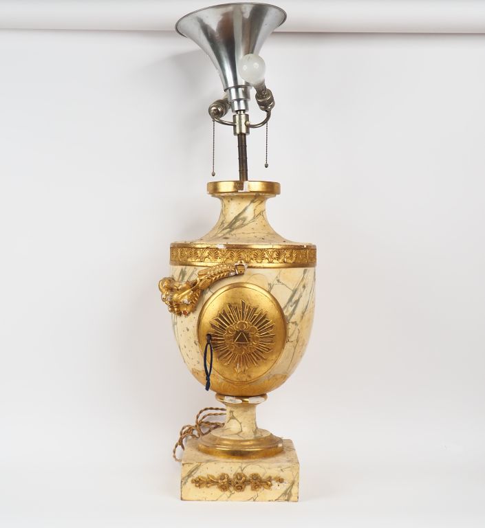 Tabernacle de style Louis XVI en bois polychrome imitant le marbre et bois doré (mauvais état). Monté en lampe. H. 68 cm