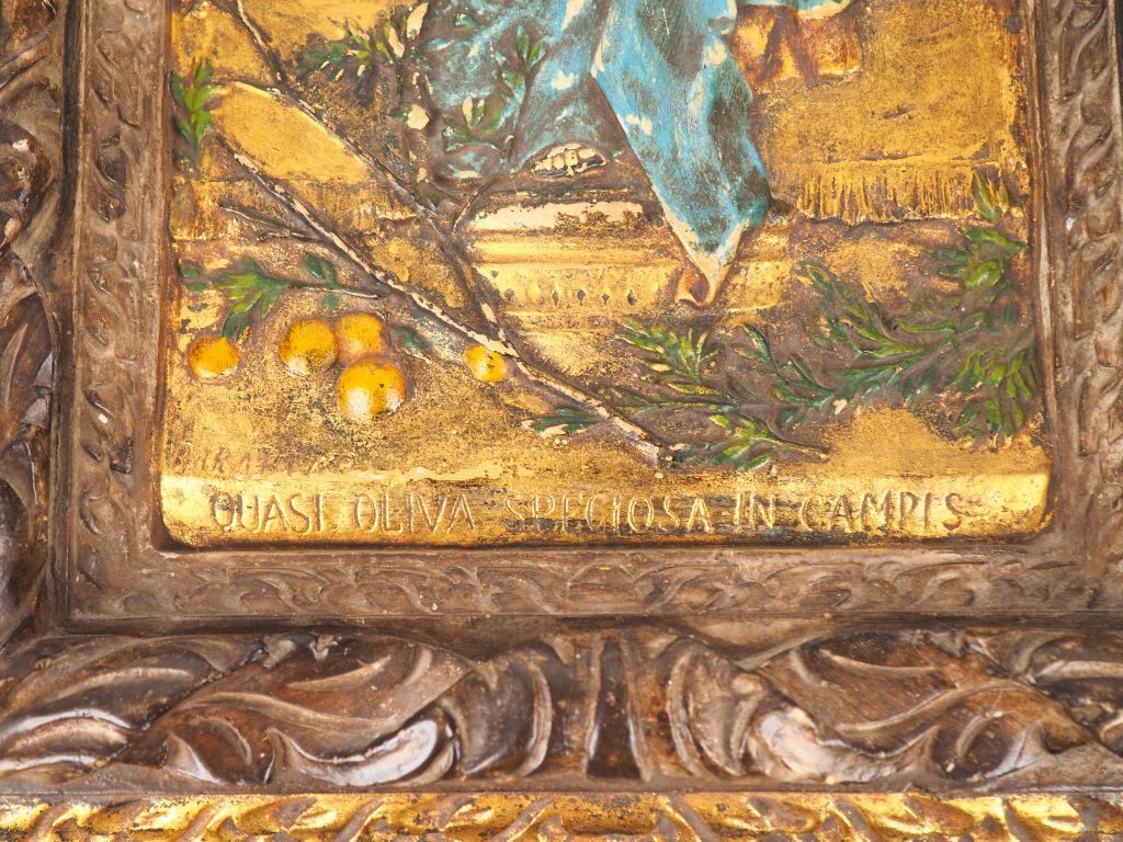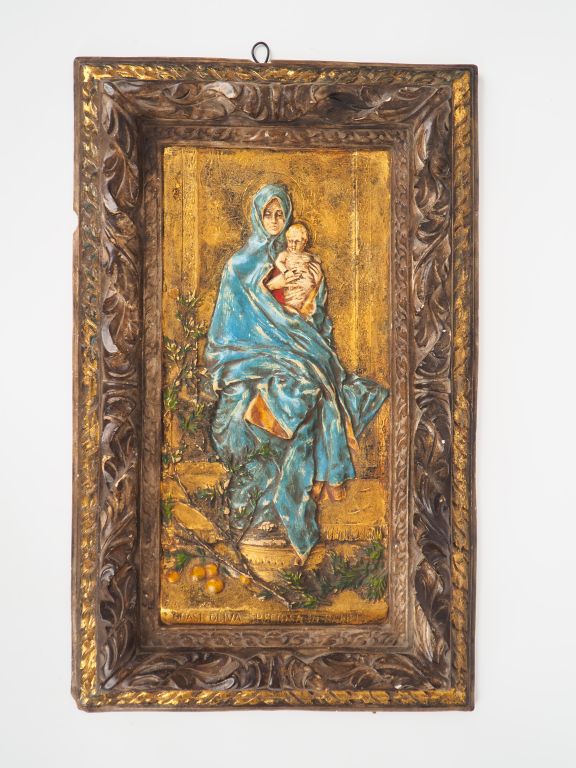 Tableau en stuc polychrome figurant une Vierge à l'Enfant dans un cadre de style Louis XVI. Dim. 60,5 x 37 cm