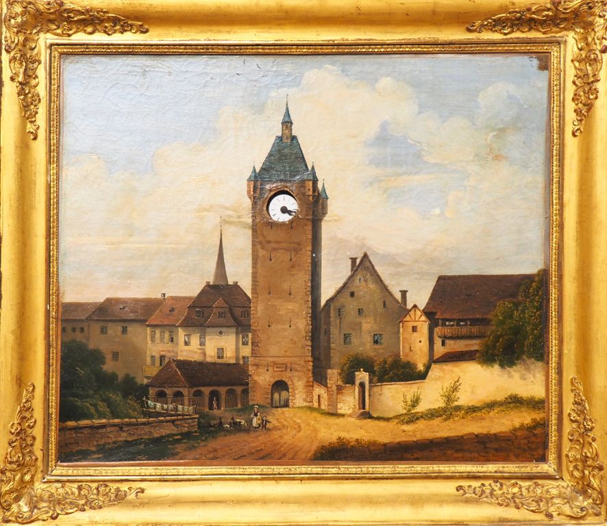Tableau horloge XIXème à décor de ville animée. Dim. avec le cadre d'origine : 58 x 66,5 cm