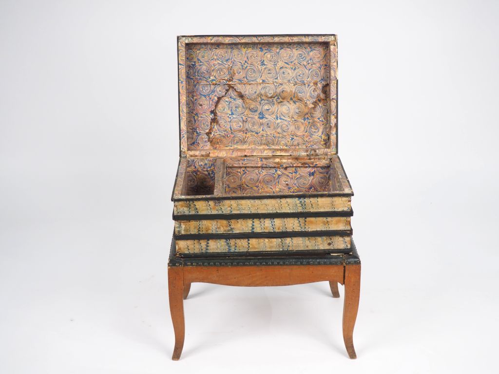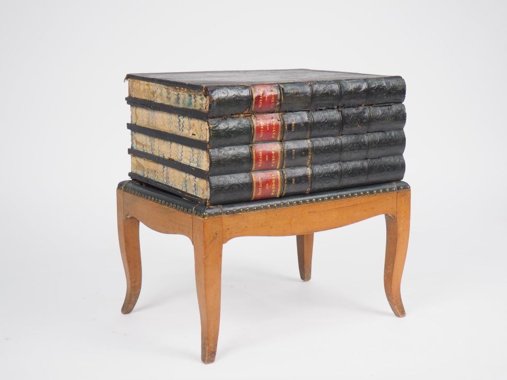 tabouret en trompe l'œil figurant une pile de livres, ouvrant à un abattant. Dim. 49 x 43 x 33 cm.
