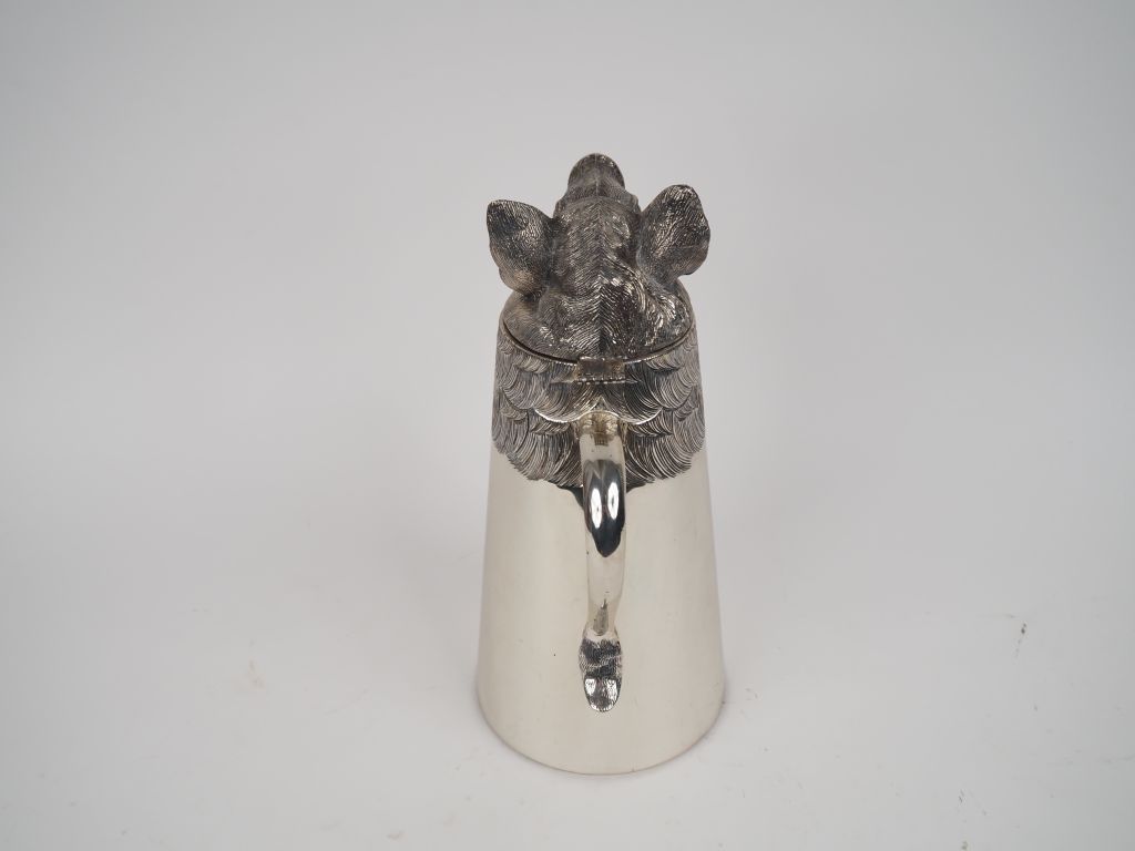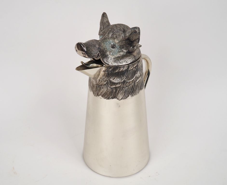 Très amusante verseuse en métal argenté à décor de hure de sanglier. H. 33,5 cm