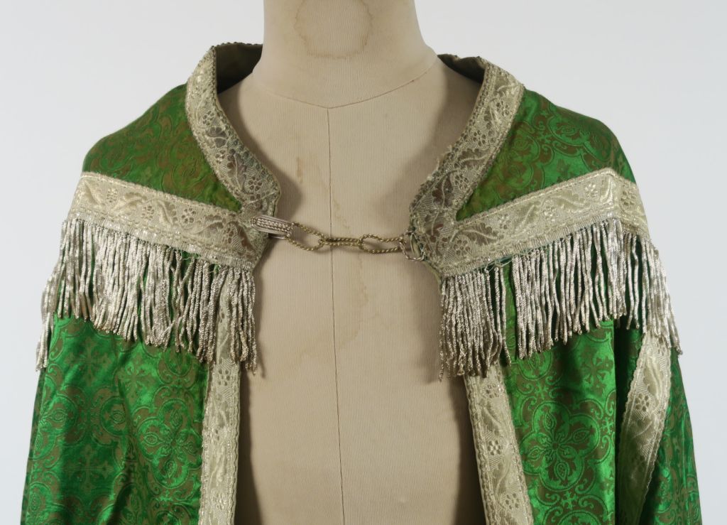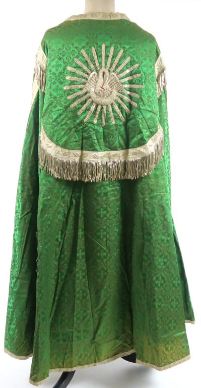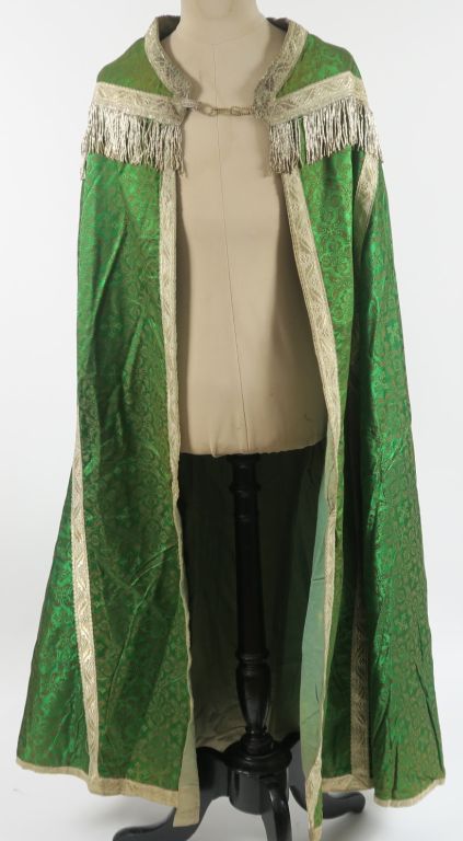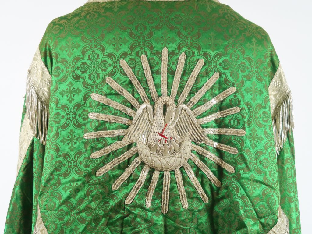 Très belle chape début XXème provenant de la maison Cabanès à Auch (étiquette au dos). Fond étoffe damassée vert émeraude , façonnée dans le gout néo-gothique. Chaperon ourlé de franges argent, soleil radiant au centre duquel s’inscrit un pélican symbole du Christ Sauveur, brodé en guipure, paillettes et frisons argent. Très joli vert lumineux . Bel état. (un accroc dans le bas de la chape. Doublure verte insolée par endroits) Expert : Véronique Dumont Castagné