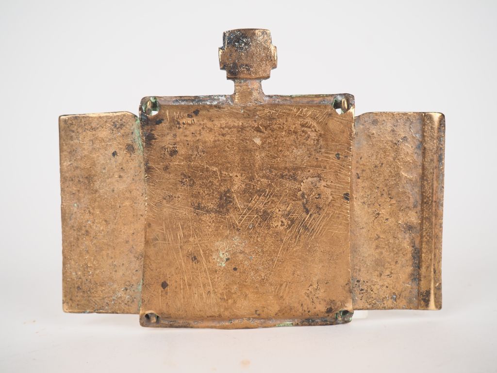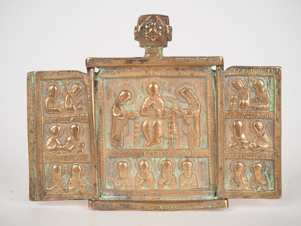 Triptyque en bronze de la Deisis et de saints choisis. Russie, XVIIIe siècle. Reprise d'un modèle du XVIe siècle. Le panneau central à deux registres : en partie supérieure la Deisis avec le Sauveur assis sur un trône et entouré de la Mère de Dieu et de Saint Jean le Précurseur. Sur la partie inférieure, les saints : Zosime et Sabbas de Solovetski, Nicolas le Thaumaturge et Léonce de Rostov. Sur chacun des volets, trois paires de bustes de saints tournés vers le Christ avec sur le volet de gauche, l'Archange Michel et l'apôtre Pierre, Basile le Grand et le mégalomartyr Georges, Jean Chrysostome et Pierre métropolite de Moscou et sur le volet de droite, l'Archange Gabriel et l'apôtre Paul, Grégoire le Théologien et le mégalomartyr Démétrios de Thessalonique, Athanase et le hiéromartyr Blaise. Bronze fondu. Dim. 9 x 6 cm (fermé) et 9 x 11,5 cm (ouvert). Expert : Nicolas Filatoff