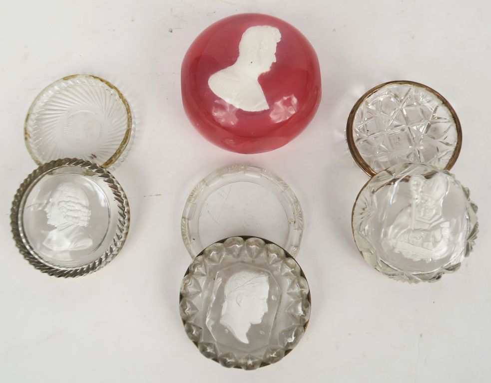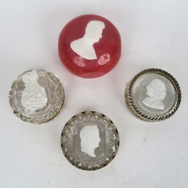 -Trois boites en cristal à monture en laiton, ornée d’un cristallocérame représentant : un profil de Napoléon Ier, un profil de Rousseau (accidents à la monture) et un buste d’évêque. Diam : 6 cm. -Presse papier au profil en cristallocérame du Roi Louis Philippe à fond rosé. Diam : 7,5 cm. A.B.E.