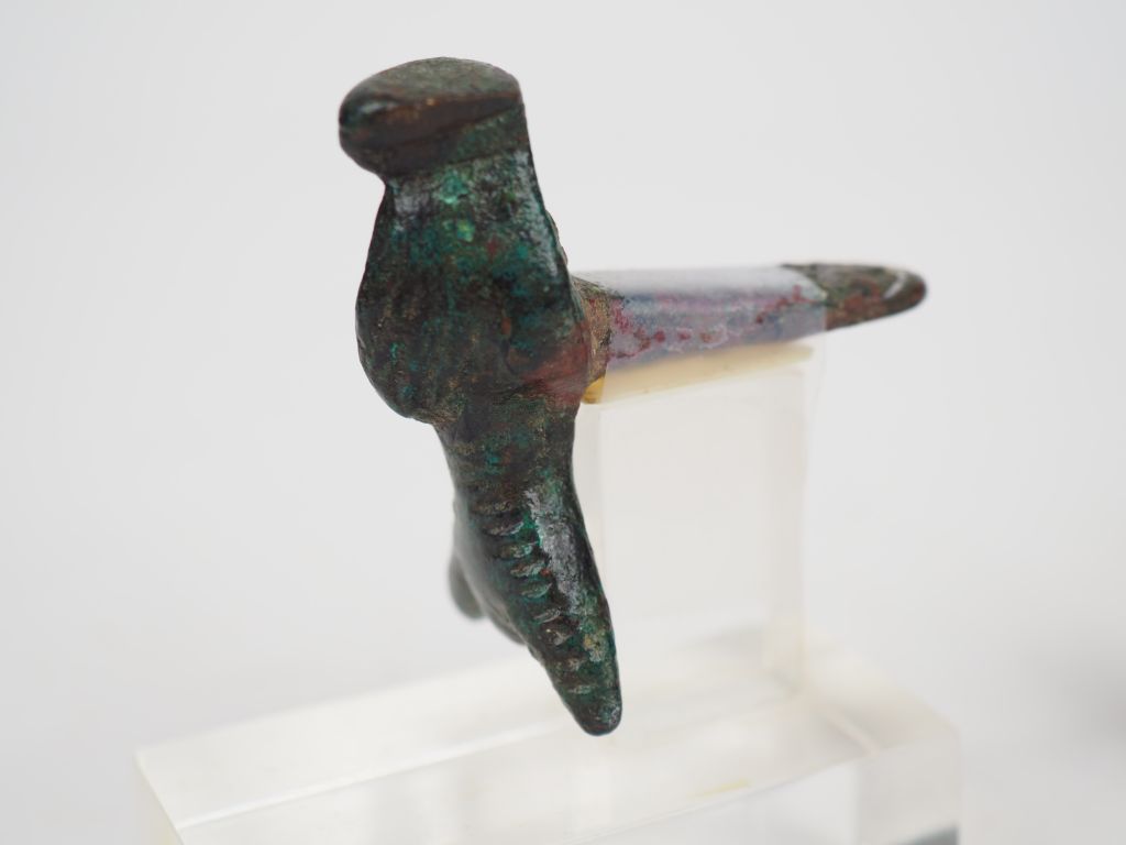 Trois bronzes zoomorphes dont un dieu debout sur un taureau. Orient ancien. Ier millénaire av. J.-C. Dim. : 5 x 5 cm, 4.5 x 6 cm, 2,5 x 5,5 cm