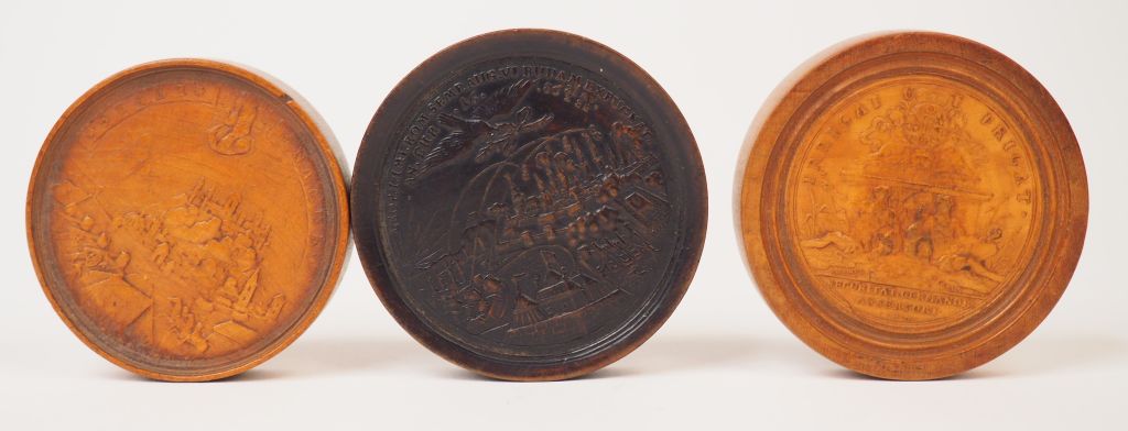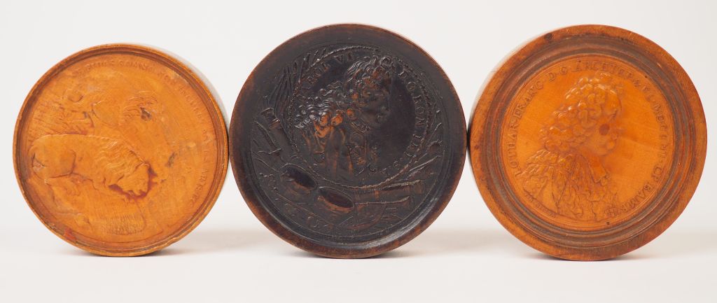 Trois différents jetons fin XIXème en buis sculpté. Diam. 5,2 cm, 5,6 cm.