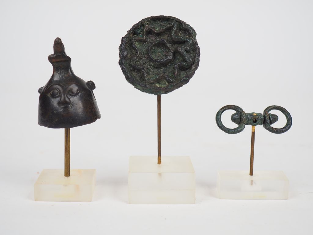 Lot de Trois objets antiques en bronze. H. : 5 cm, 4.5 cm et L. : 4.5 cm. au prix de 20 à 30 € en vente aux enchères par l'hôtel des ventes Primardeco