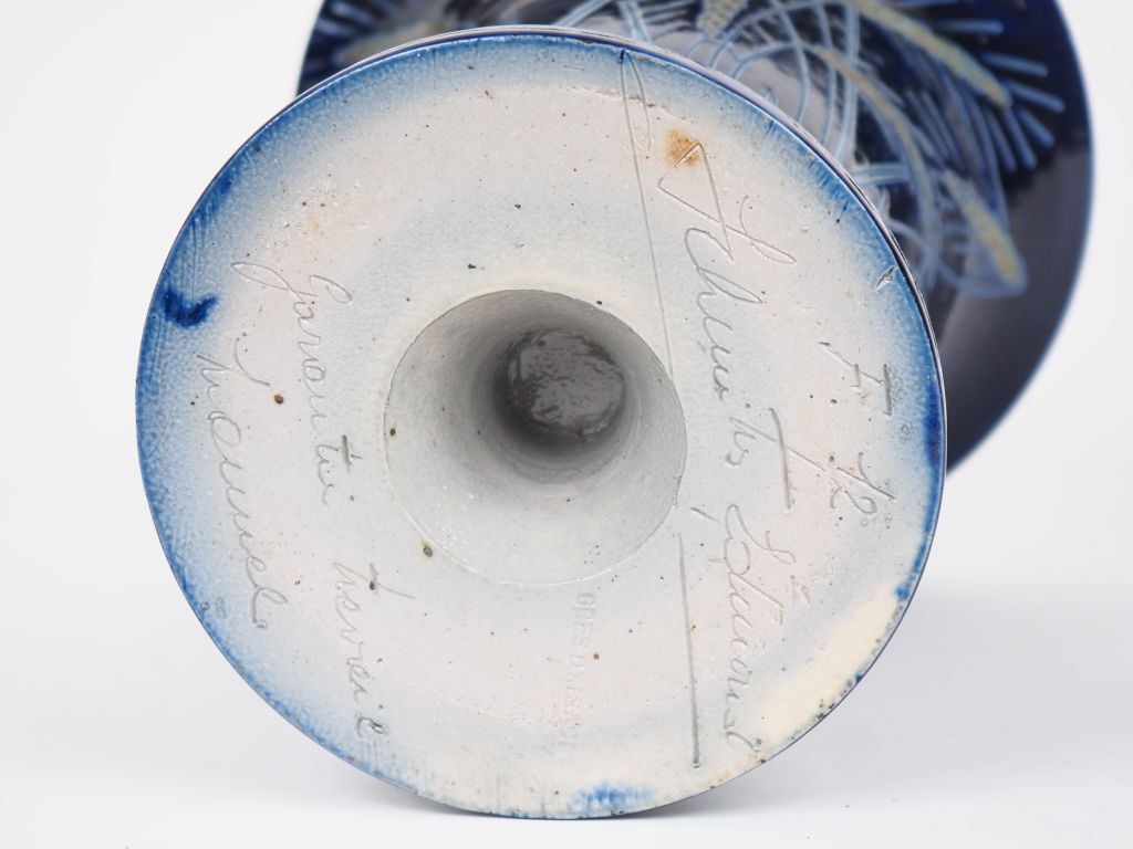 Vase cornet Art Déco en grès d'Alsace bleu à décor d'épis de blé. Signé. H. 25 cm