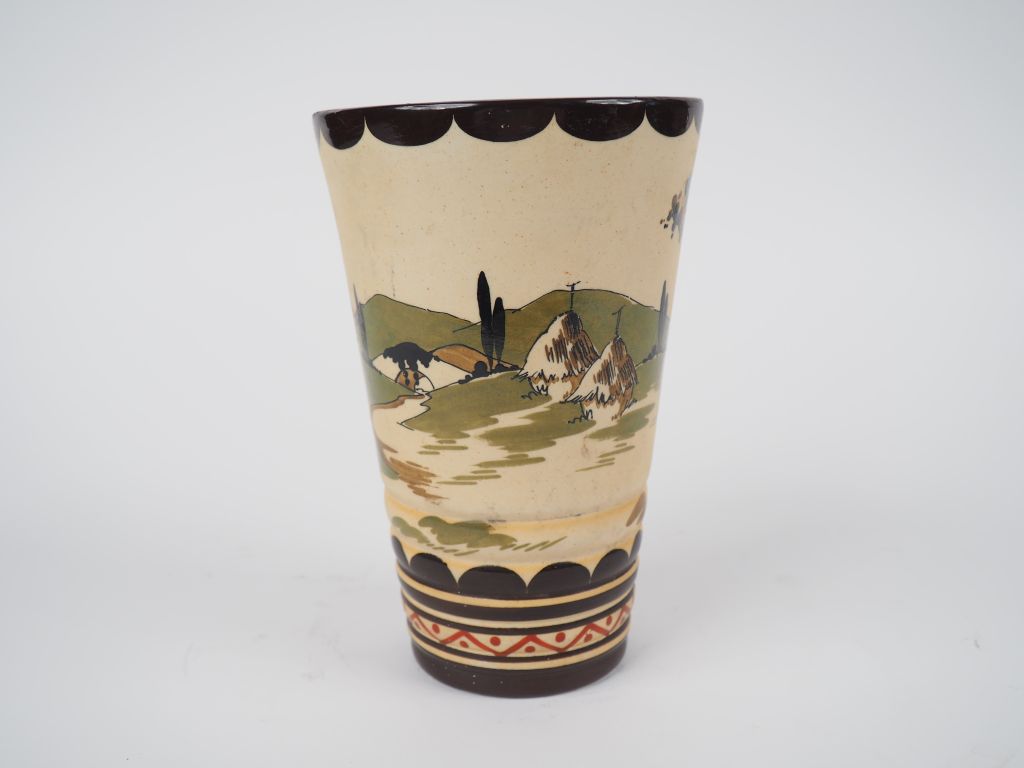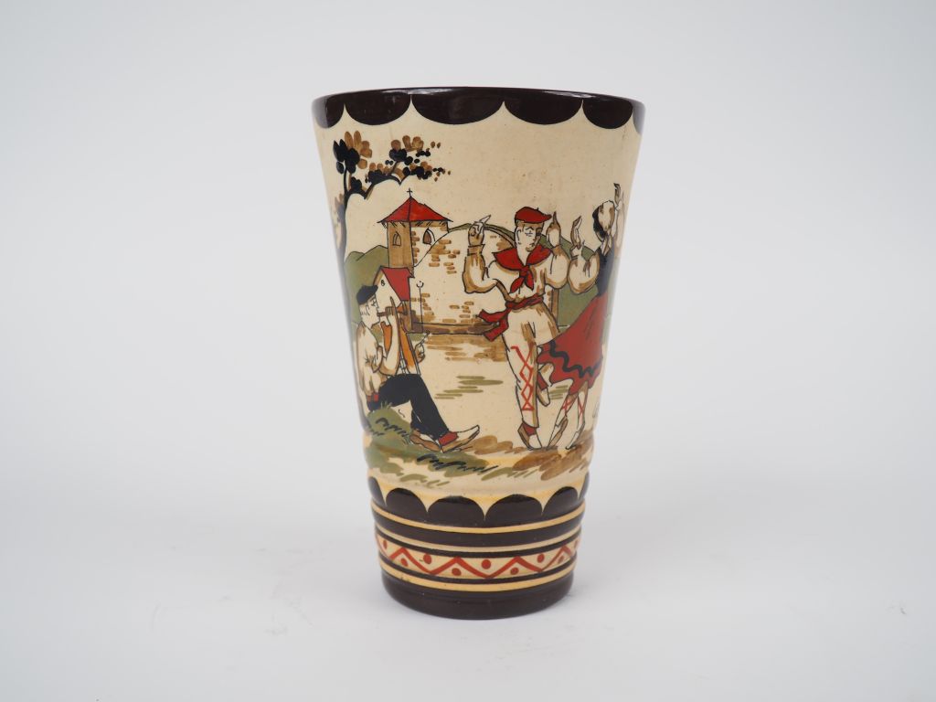 Vase cornet en grès polychrome à décor de fandango du pays basque. Signé Gataud H. 20,5 cm