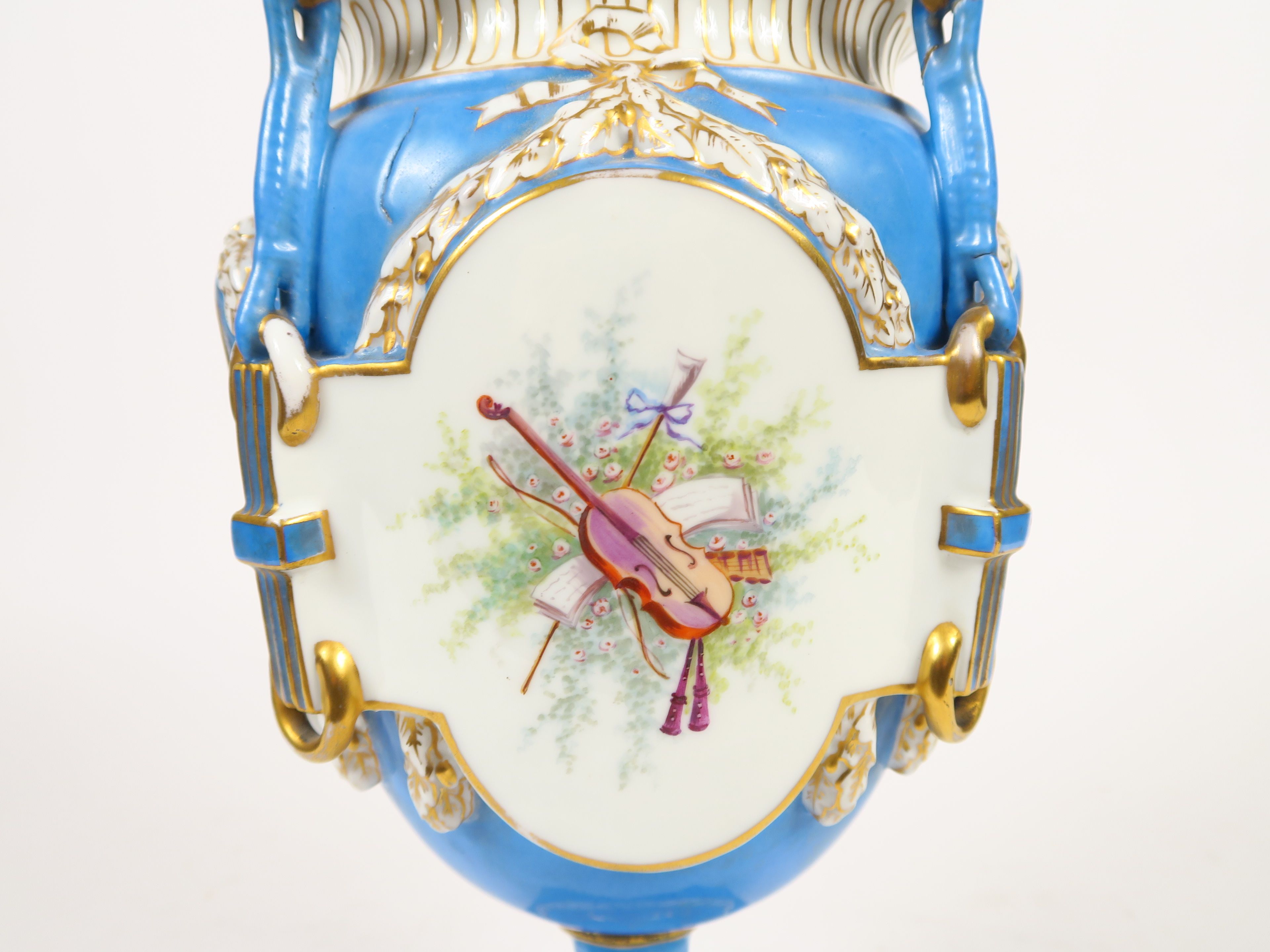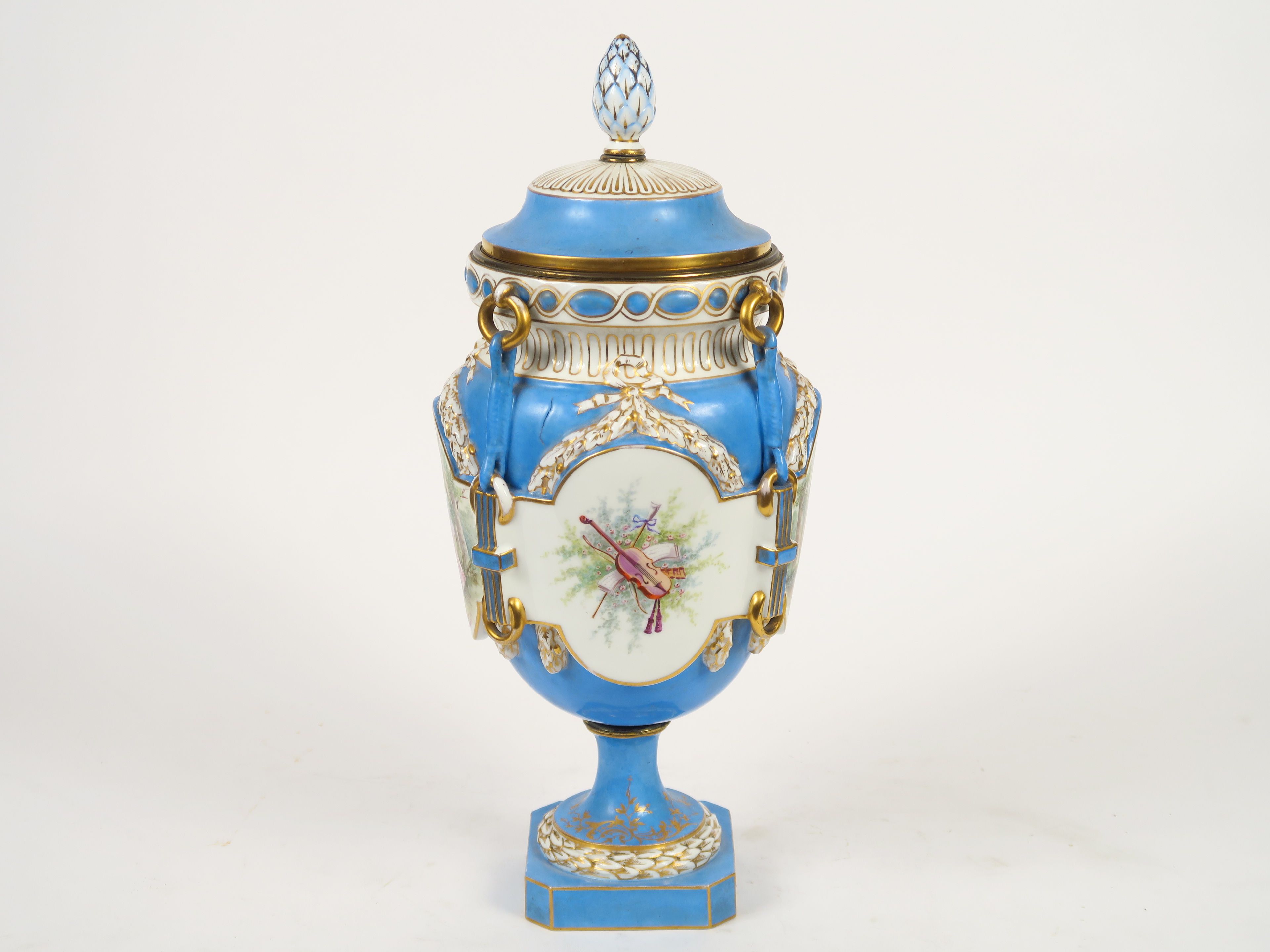 Vase couvert de style Louis XVI en porcelaine dans le goût de Sèvres, à décor dans des réserves de scènes galantes et de trophées sur fond bleu céleste. H. 47 cm (fel de cuisson, accidents)
