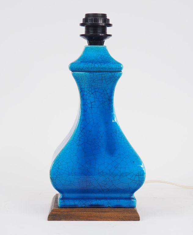 Vase en porcelaine de Chine à fond bleu craquelé. Monté en lampe. H. 2...