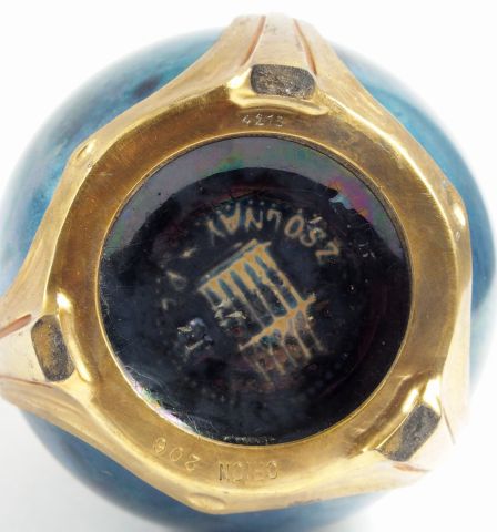 ZSOLNAY. Pot en céramique irisée bleu-vert, monture en métal doré signée Orion et numéroté 206. H. : 14,5 cm