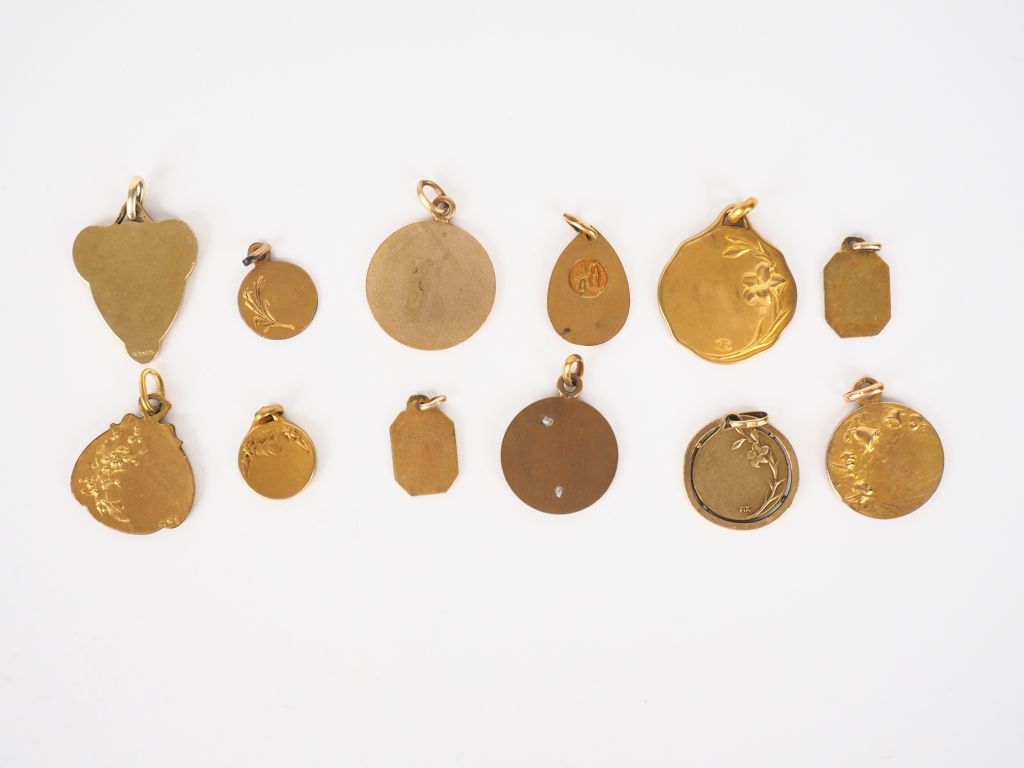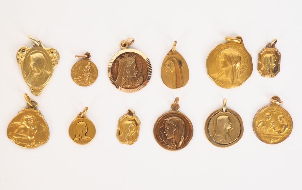 12 différentes médailles religieuses en métal doré ou plaqué.
