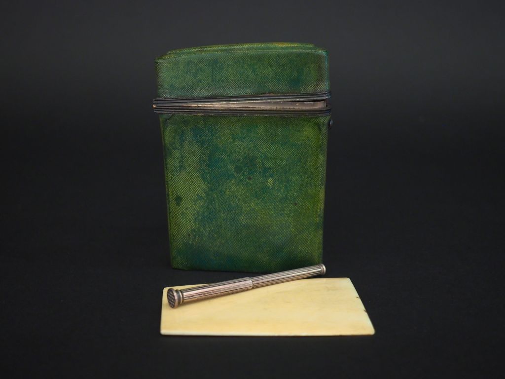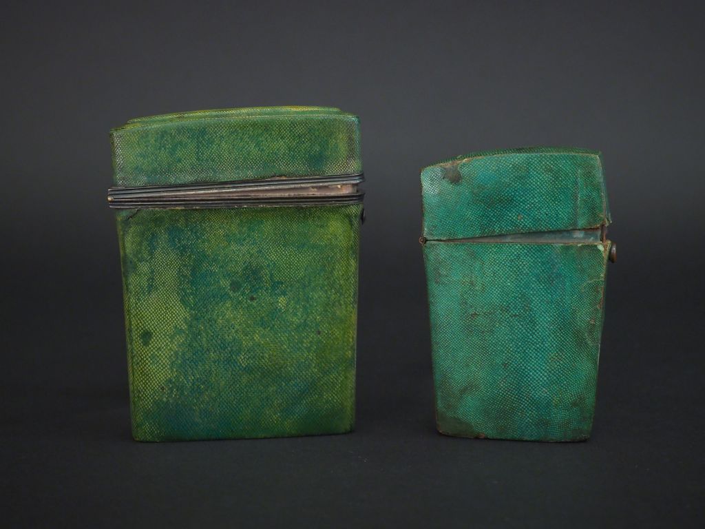 2 différents étuis rectangulaires XIXème en galuchat vert, monture en argent pour l'un avec un crayon signé Longmore à Londres. Dim. 11,2 x 8,5 cm. Dim. 9,7 x 6,5 cm. (usures).