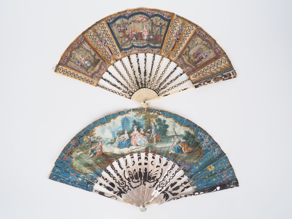 2 différents éventails Louis XVI à feuilles pliées en nacre et os, à décor de scènes galantes. Dim. 26 x 49 cm. (accidents).