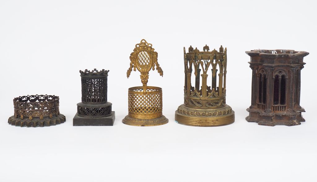 5 différentes montures de photophores ou vases en bronze ou laiton de style néogothique. H. de 5 à 15 cm.