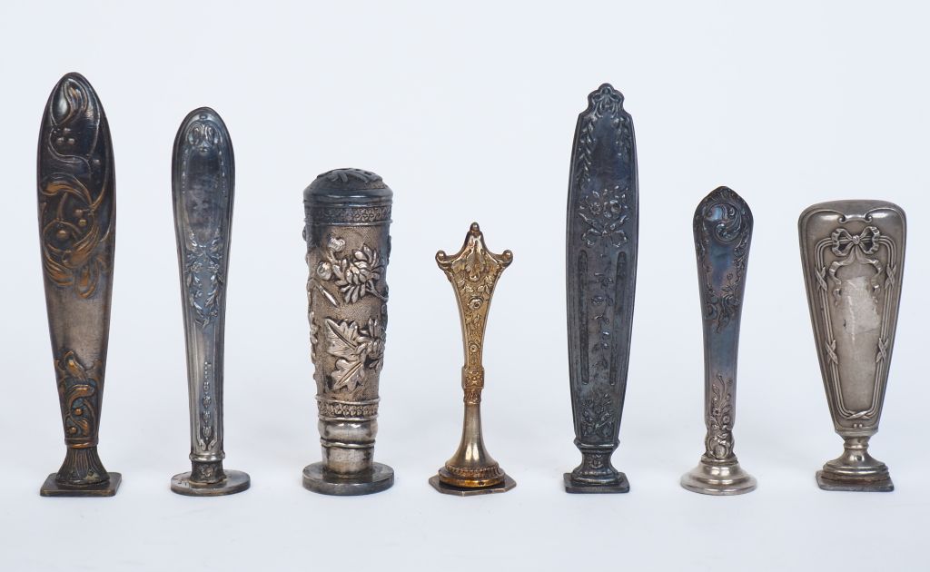 7 cachets 1900 en métal argenté, argent fourré ou métal doré. H. de 5,5 à 9 cm.