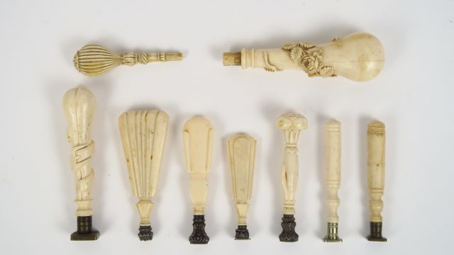 7 différents cachets XIXème en ivoire et os et 2 élements de cachets