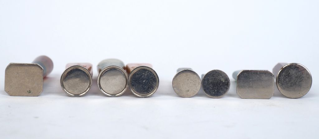 8 cachets en pierre dure, composition et métal argenté. H. de 4 à 7,5 cm.