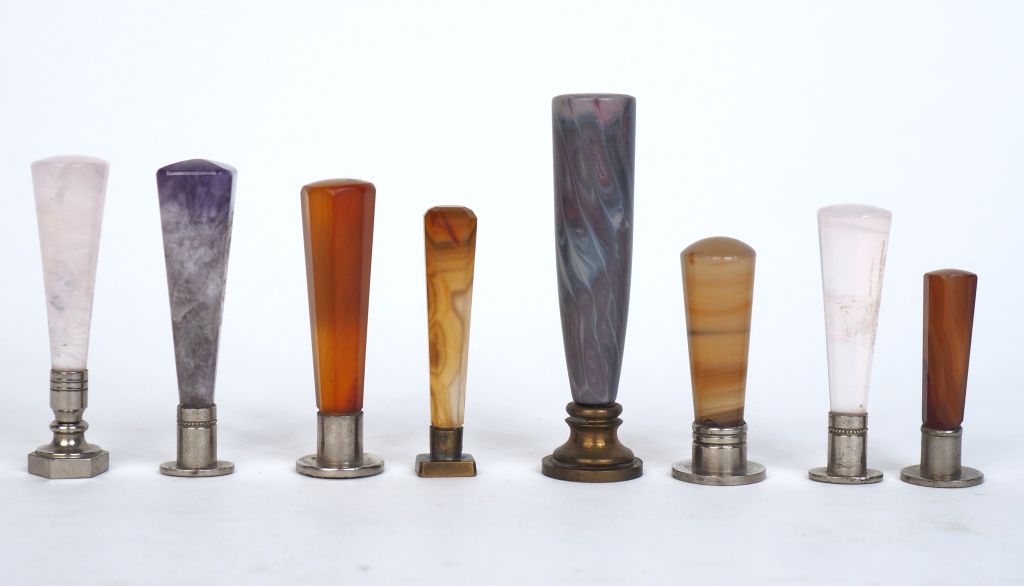 8 cachets en pierre dure, composition et métal, un cachet en composition H. de 4,3 à 7,5 cm.