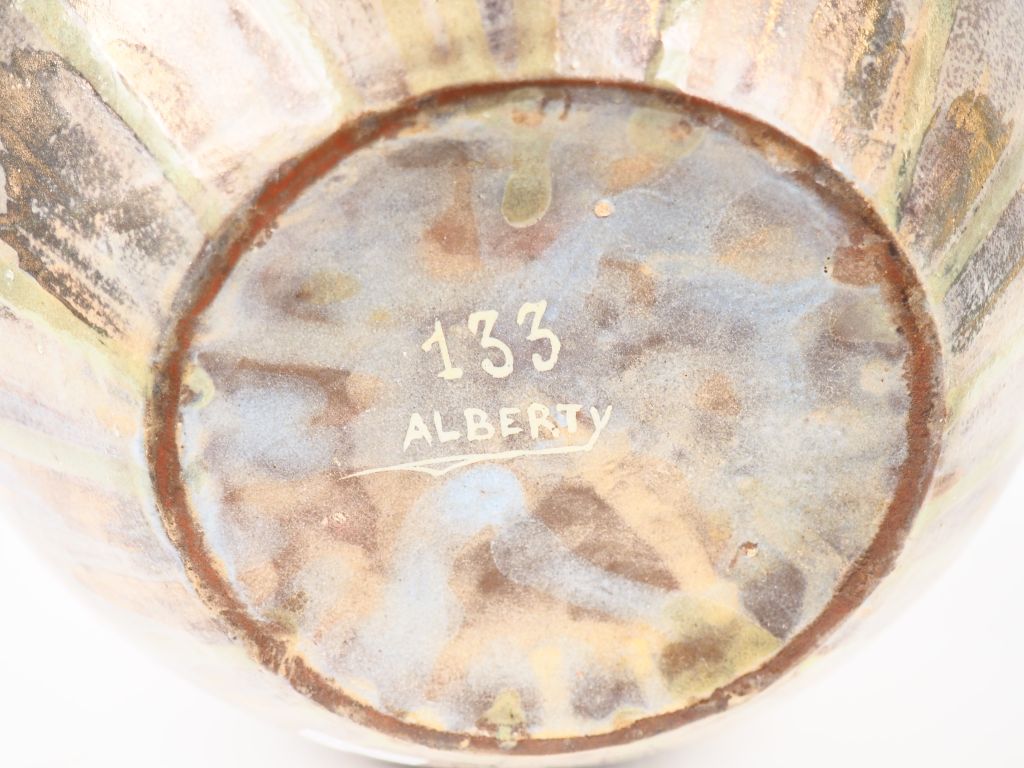 ALBERTI. Vase à anses ovoide en grès flammé et irisé. Signé H. 22 cm PIERREFONDS. Pichet en grès flammé bleu vert des Vosges. H. 28,5 cm